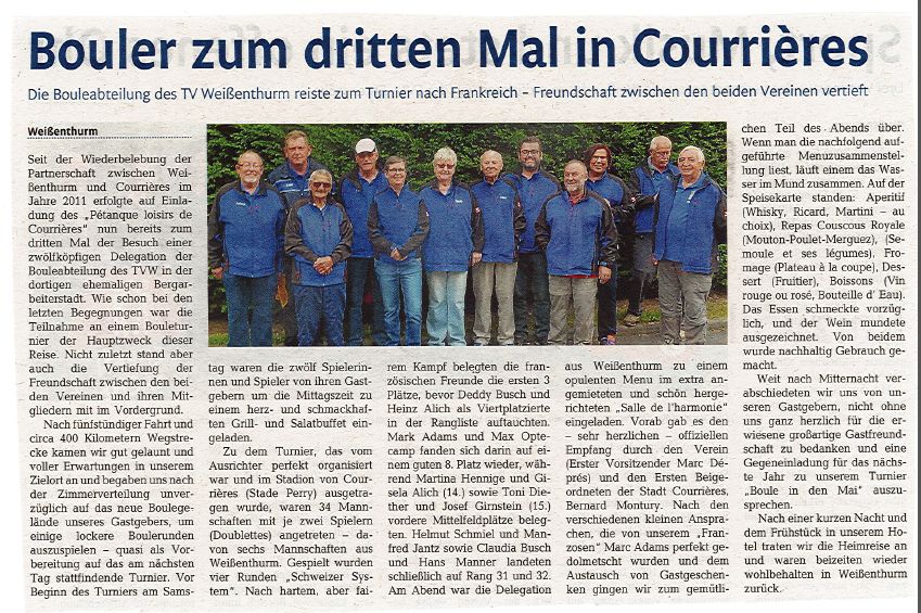 Mit 19 Aktiven machte sich die Boule-Abteilung des TV Weißenthurm am Freitag, dem 06.09.2013 in einem 20-Sitzer Bus frohgelaunt auf den weiten Weg zu einer 3-tägigen Fahrt in die Weißenthurmer Partnerstadt, Courrières / Frankreich. Hintergrund war die Gegeneinladung des „Boule Club Petanque Loisir de La Louissiane“ zur Teilnahme an einem Boule-Turnier für einen im vergangenen Jahr erfolgten Besuch der Boule-Freunde aus Courrières in Weißenthurm. Nach angenehmer Fahrt kam die „Truppe“ am späten Nachmittag in dem etwas außerhalb von Courrières gelegenen Hotel an und begab sich im Anschluss an die Zimmerverteilung am frühen Abend zu einem Empfang durch den Bürgermeister, Herrn Christophe Pilch, ins Rathaus von Courrières, wo auch ein kleiner Imbiss und Getränke auf uns warteten. Natürlich waren auch die Boule-Freunde aus Courrières– mit ihrem Präsidenten Daniel Millan und seinem „Vize“ Marceau Dufour an der Spitze – zur Begrüßung erschienen. Man begegnete sich sofort wieder in herzlicher Atmosphäre und ließ die Erinnerung an vergangene Treffen wieder aufleben. Abteilungsleiter Deddy Busch übergab als Gastgeschenk eine Fotomontage mit Bildern vom Besuch der Courrièrer in Weißenthurm im letzten Jahr. Nach der Beendigung des Empfangs erkundeten wir – bevor wir müde in die Betten sanken - in einem in der Nähe unseres Hotels gelegenen Restaurant die wohlschmeckende französische Küche.