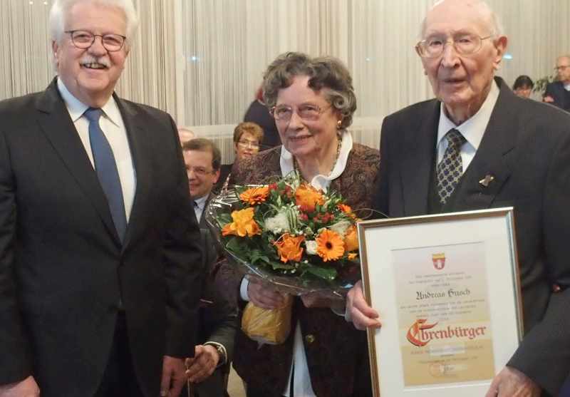 Heim, der bereits in seiner Begrüßung die Verdienste des in der damals noch selbständigen Gemeinde Irlich als Sohn des Schlossermeisters Josef Busch und seiner aus Weißenthurm stammenden Ehefrau Gertrud, geborene Graf , zur Welt gekommene Andreas Busch gewürdigt hatte, konnte bei der Feierstunde der hohen Auszeichnung viele Persönlichkeiten des privaten und öffentlichen Lebens willkommen heißen. Dabei erwähnte er natürlich zunächst Ehefrau Marlene, geborene Gecks, die Andreas Busch in Weißenthurm bei einer Kirmes kennengelernt hatte und die er in jedem Fall heiraten wollte, was er dann auch 1952 tat. Das Ehepaar konnte sich über die Geburt einer Tochter und eines Sohnes freuen, die am Thur aufwuchsen. Weiter befanden sich unter den Gästen im Rathaussaal neben zahlreichen Ratsmitgliedern auch die früheren Bürgermeister(in) Hans-Wilhelm Bubenheim, Gertrud Wagner, die im weiteren Verlauf der Ehrung die Laudatio hielt , sowie Karl-Heinz Thilmann. Und auch der ehemalige Beigeordnete der Verbandsgemeinde und ebenfalls in der lokalen Geschichtsforschung bzw. bei der örtlichen Denkmalsbetrachtung und – Beschreibung engagierte Hermann Dötsch war im Rathaussaal zugegen, als der Bürgermeister die diversen Meriten des im Februar 95 Jahre alt werdenden ehemaligen Drehers und Schlossers bei der Firma Rasselstein und späteren Ingenieurs erwähnte.