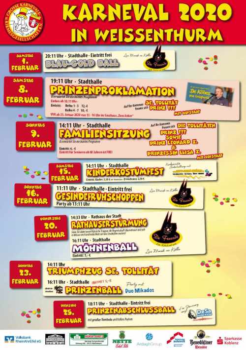 Karnevals-Familiensitzung der Stadt Weißenthurm 2020Wie in jedem Jahr findet die Familiensitzung am Sonntag, den 09. Februar 2020, nach der Prinzenproklamation am Tag zuvor, in der Stadthalle statt. Beginn ist um 14:11 Uhr. In Zusammenarbeit mit der Ka & Ki bietet die Stadt in der Hauptsache den älteren Mitbürgern und Familien mit Kindern die Gelegenheit, den frisch inthronisierten Prinz ??? mit seinem Hofstaat zu begrüßen und das tolle karnevalistische Programm der vielen Akteure in guter Stimmung und bester Laune zu erleben. Prinz ??? und sein Hofstaat freuen sich mit dem Kinderprinzenpaar auf eine gute Stimmung und tatkräftige Unterstützung aller Bürgerinnen und Bürger unserer Stadt in der Session 2020. Die Sitzung verspricht viele tolle Höhepunkte. Für die Generation ab 60 Jahren ist der Eintritt zu dieser Veranstaltung frei. Für Eltern mit Kindern, die gemeinsam mit Oma + Opa die Veranstaltung besuchen möchten, zahlen die Erwachsenen und Kinder ab 12 Jahren einen Eintritt von € 4,-.