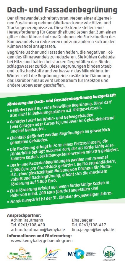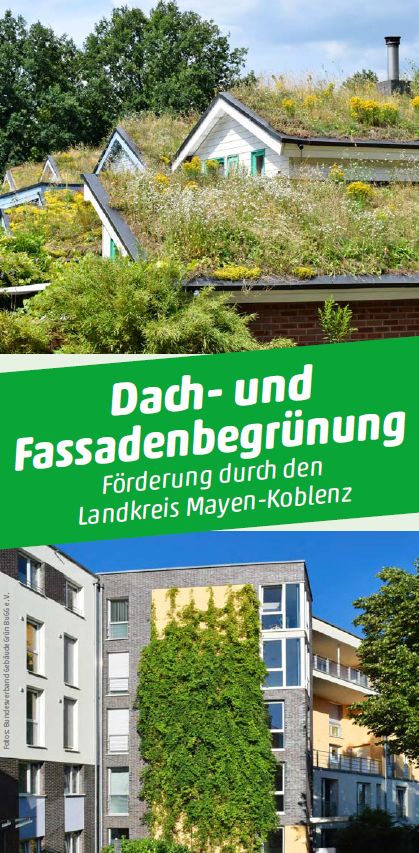 Zusätzlich bietet der Landkreis Mayen-Koblenz das Förderprogramm „Dach- und Fassadenbegrünung“ an. Gefördert wird bei Wohn- und Nebengebäuden wie Garagen oder Carports und zwar im Gebäudebestand und bei Neubauten, seit 2025 sind auch Eigentümer gewerblich genutzter Gebäude förderberechtigt. Die Förderung erfolgt in Form eines Festzuschusses wobei die Förderhöhe maximal 40% der als förderfähig anerkannten Kosten beträgt. Dach- und Fassadenbegrünungen werden mit maximal 2.000 Euro pro Grundstück gefördert. Bei Solargründächern, d.h. einer gleichzeitigen Nutzung von Dächern für Photovoltaik und Dachbegrünung, erhöht sich die maximale Förderung auf 3.000 Euro. Einreichungsschluss ist der 31. Oktober 2026.