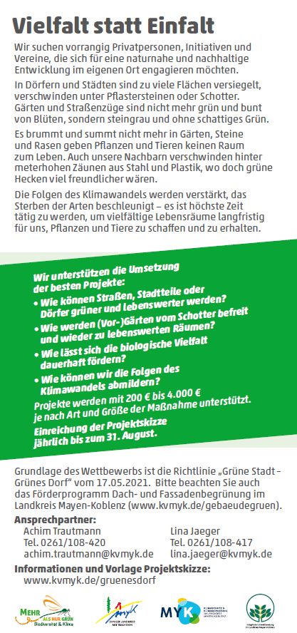 Es brummt und summt nicht mehr in Gärten, denn das vermehrte Anlegen von Schotter- und Pflasterflächen, aber auch von reinen Rasenflächen, lässt kaum Platz für Tiere und blühende Pflanzen. Mit dem Wettbewerb „Grüne Stadt - Grünes Dorf“, ruft der Landkreis Mayen-Koblenz Privatpersonen, aber auch Initiativen/Vereine, Kitas/Schulen und Unternehmen/Kommunen dazu auf, sich aktiv für mehr Vielfalt und Natur in Straßen, Stadtteilen oder Dörfern einzusetzen. Der eigene Ort, soll bunter, naturnaher und nachhaltiger werden. Es wird die Umsetzung von Projekten mit 200 Euro bis 4.000 Euro je nach Art und Größe der Maßnahme unterstützt. Die Projektvorschläge können ab sofort als Projektskizze eingereicht werden. Einsendeschluss ist der 31. August 2026. Gesucht werden Projekte, die im innerörtlichen oder ortsnahen Bereich einen Beitrag zur biologischen Vielfalt leisten bzw. durch bspw. Rückbau von Versiegelungen und Verwendung von heimischen Pflanzen einen Lebensraum für Tiere und Insekten schaffen.